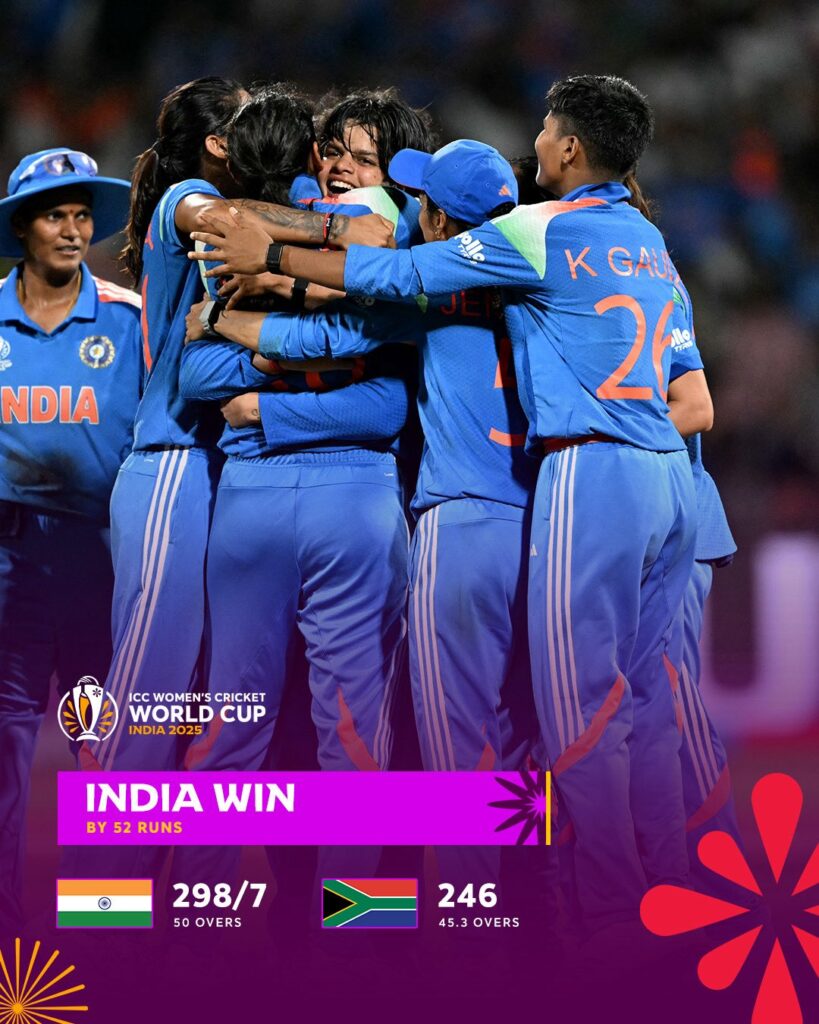 विमेंस वर्ल्ड कप में टीम इंडिया ने दक्षिण अफ्रीका को 52 रनों से हराकर वर्ल्ड कब पर कब्जा जमाया. पहले खेलते हुए भारतीय महिला क्रिकेट टीम ने 7 विकेट खोकर 298 रनों का स्कोर खड़ा किया. लक्ष्य का पीछे करते हुए दक्षिण अफ्रीका की टीम 45.3 ओवर में 246 रन बनाकर ऑल आउट हो गई. दीप्ति शर्मा ने शानदार गेंदबाजी करते हुए 9.3 ओवर में 39 रन देकर 5 विकेट हासिल की.