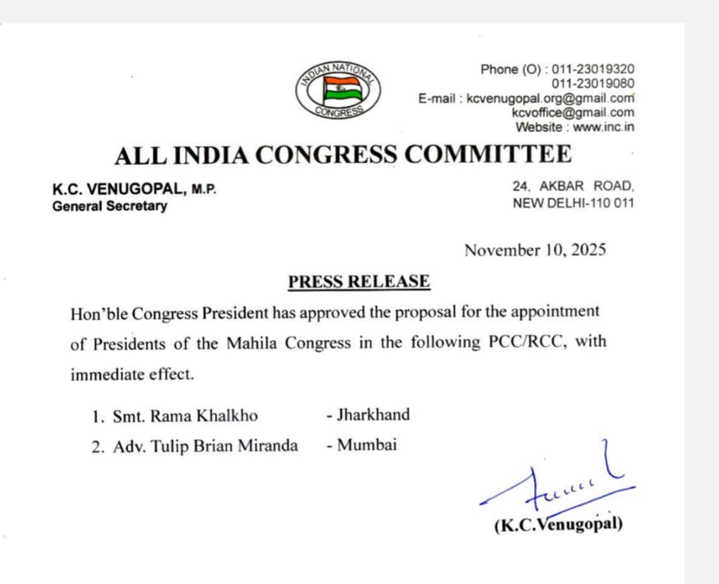 रांची. ऑल इंडिया कांग्रेस कमेटी ने महिला मोर्चा को नई दिशा देने के लिए झारखंड महिला कांग्रेस अध्यक्ष की कमान रमा खलखो को दिया है. इससे संबंधित आधिकारिक आदेश जारी कर दिया गया है. इससे पहले झारखंड महिला इकाई के अध्यक्ष की जिम्मेवारी गुंजन सिंह संभाल रही थी.